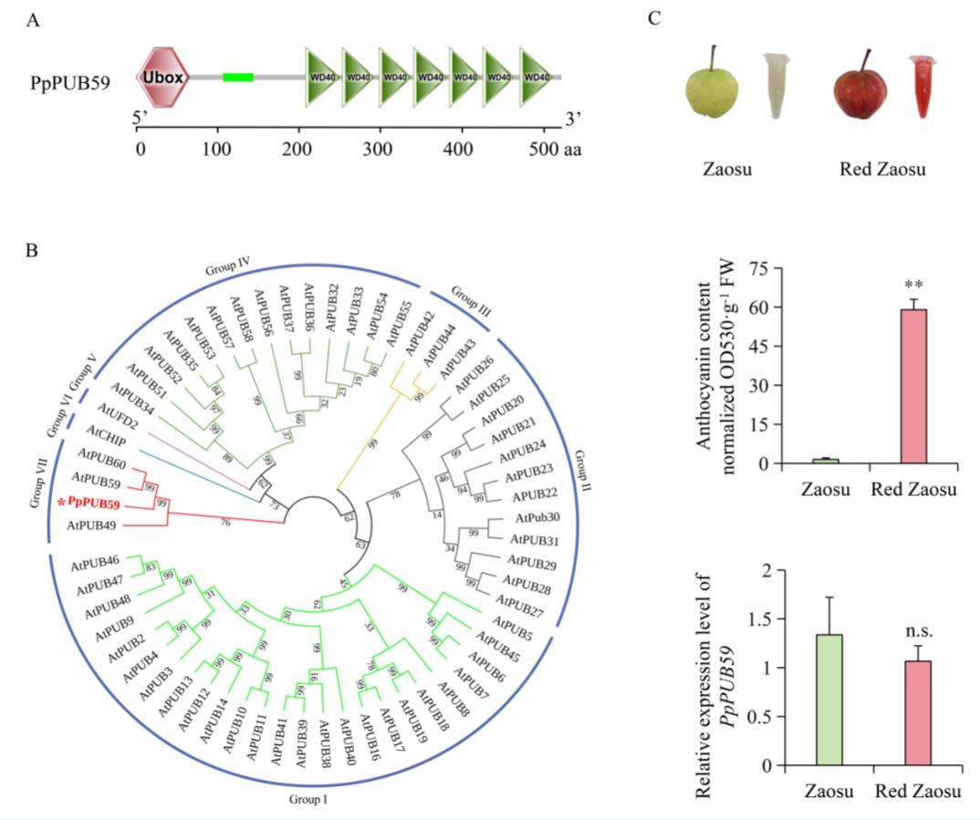文章标题Plant U-box E3 ligase PpPUB59 regulates anthocyanin accumulation by ubiquitinating PpBBX24 in ‘Zaosu’ pear and its red bud mutation