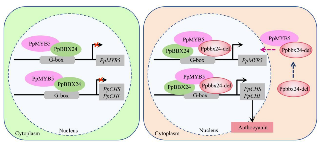 PpMYB5、PpBBX24及Ppbbx24-del在‘早酥’(左侧)和‘红早酥’(右侧)梨中对花青素生物合成的协同调控作用