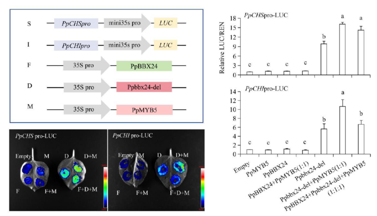 双荧光素酶报告实验证实PpMYB5、Ppbbx24-del及PpBBX24对PpCHS和PpCHI启动子活性的影响