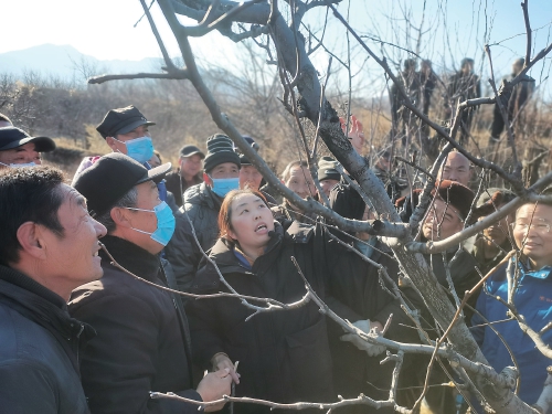 赵德英(前排左一)在田间进行果树剪枝培训。