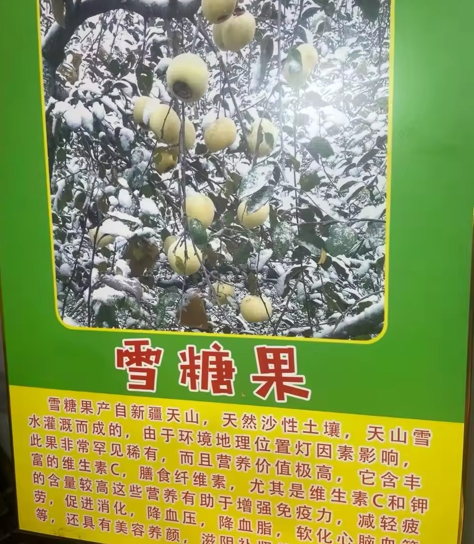 随后,新京报记者在社交平台搜索发现,不少消费者也曾购买到“天山雪糖果”。有网友称自己以60元一斤的价格购入,并展示卖家宣传图,上面描述该水果“产自新疆天山,天然沙性土壤,天山雪水灌溉而成,极为稀有且营养价值高,具有增强免疫力、缓解疲劳、促进消化等功效”;也有网友反映,买到的“天山雪糖果”外表像苹果,尽管商家宣传是新疆特产,但回家品尝后发现口感寡淡,与试吃时的超甜体验截然不同,因此怀疑现场切果的刀具可能涂抹了蜂蜜;还有网友表示,购买后品尝发现其口味与普通苹果并无明显区别。
